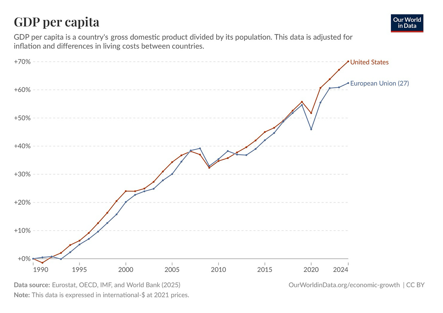 Le PIB par habitant, corrigé des différences de coûts de la vie, a augmenté de 70 % aux États-Unis depuis 1990, contre 63 % dans l’UE-27.