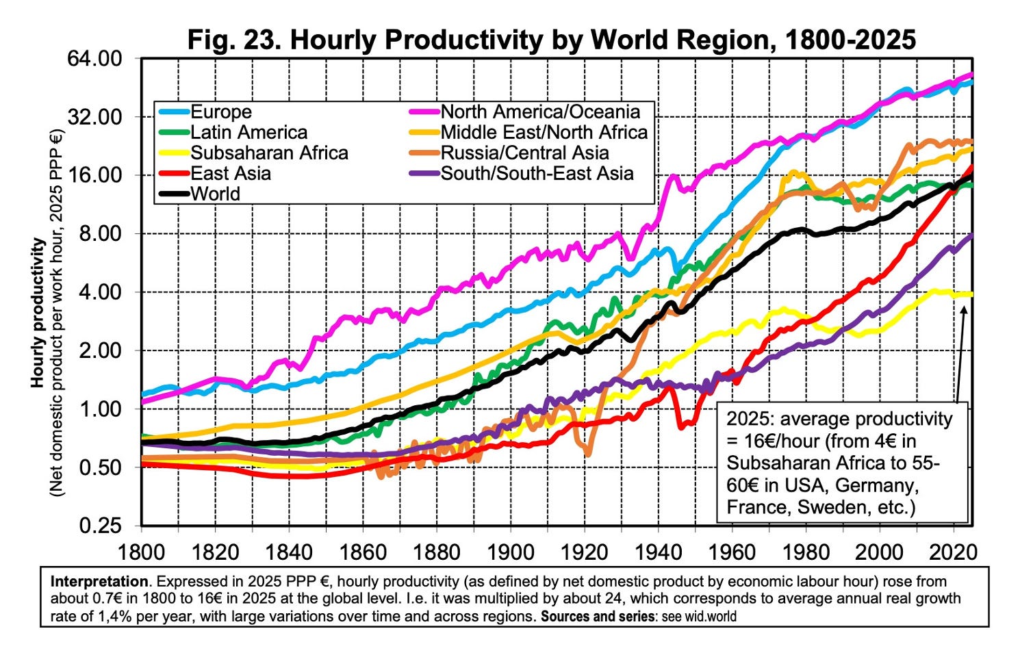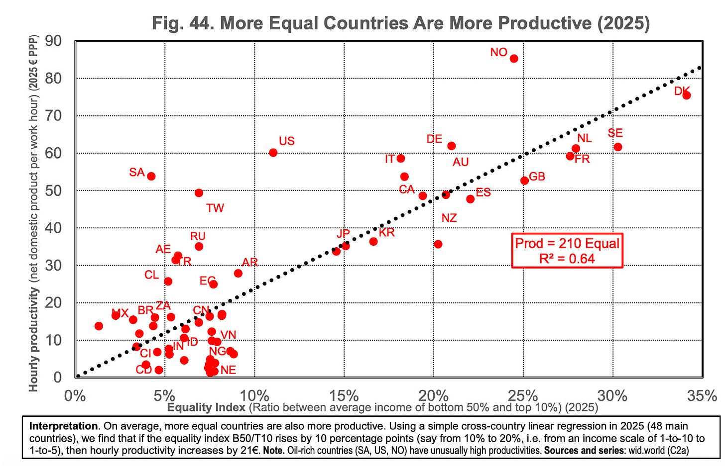 Dans les deux cas, les travailleurs produisent 60 euros en moyenne par heure travaillée, selon les données les plus récentes du Laboratoire sur les inégalités mondiales.