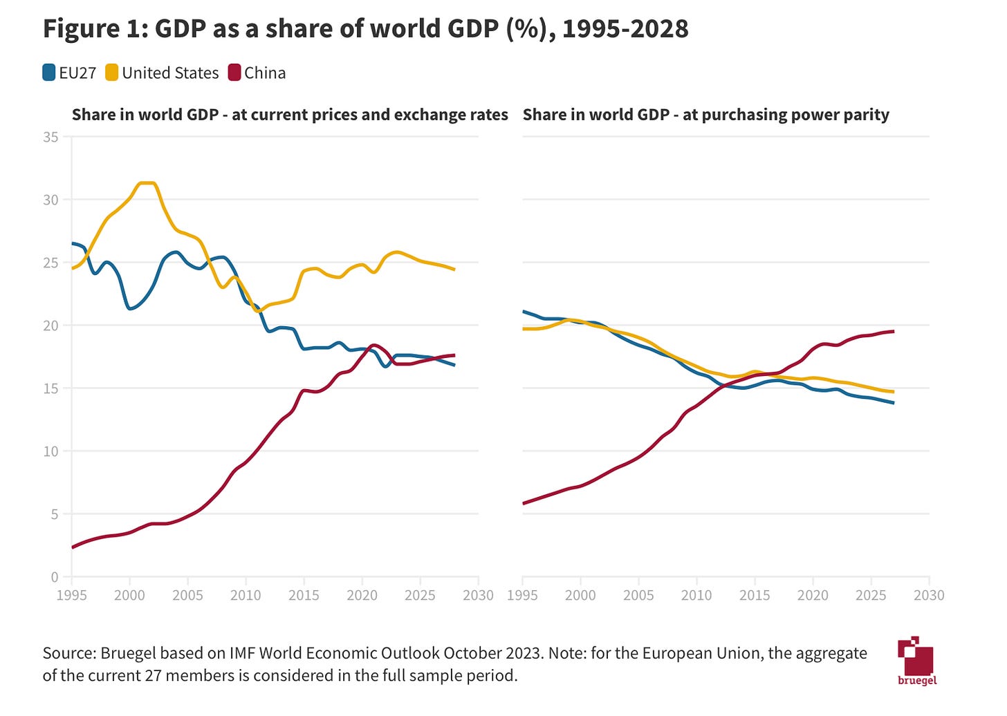 L’Union européenne, comme les États-Unis, ont vu leur part du PIB mondial baisser de 20 % en 1995 à 15 % aujourd’hui.